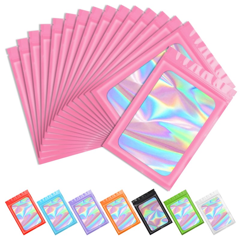 FUNFERY Funfery 100 pcs Pink Smell Proof Mylar Holographic Bags Packaging Bags, Clear Resealable Odor Proof Bag Foil Pouch Bag for Food Storage,Lipgloss,Jewelry,Eyelash Packaging Small Business(2.4x3.9Inch)