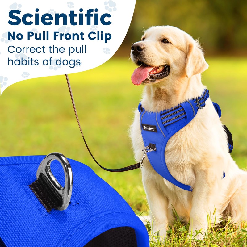 Funfox Dog Harness Small No Pull, Adjustable 2 Clips Anti-Pull Vest with Practical Handle, Breathable Padded Pet Harness Designed for Small/Large Breeds, Reflective Training Walking Blue S