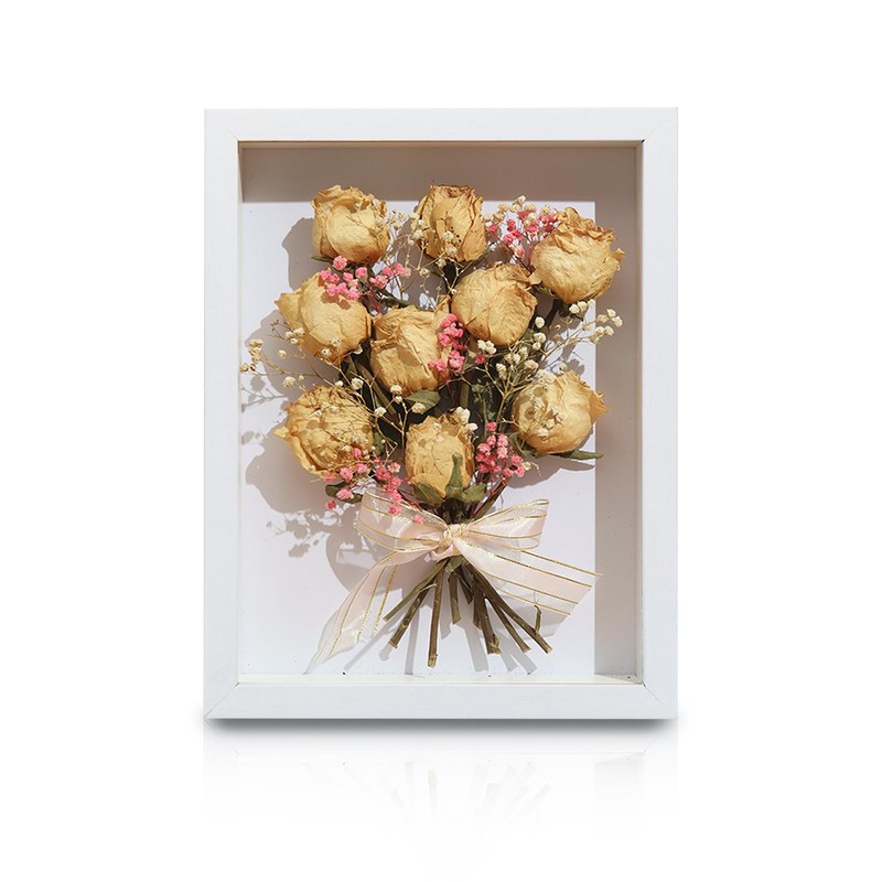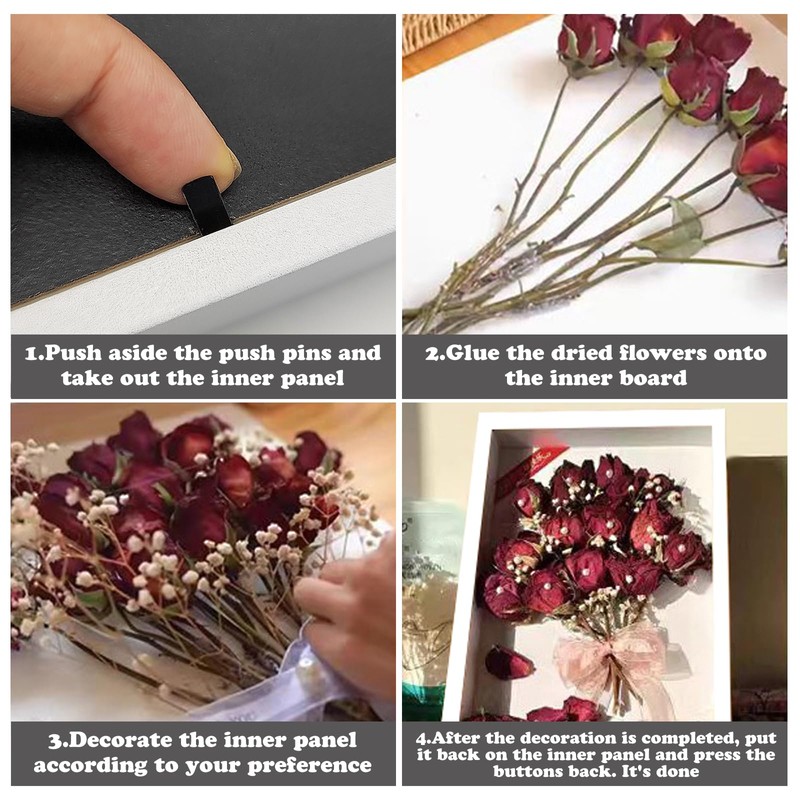 • 【EASY TO ASSEMBLE】Our deep flower box is effortless to install. First you need to open the cutting nails on the back of the frame and put the dry flowers, leaves or other items on the backing paper, then put your artwork and backboard into the frame. Finally, press all nails back, and the installation is complete.