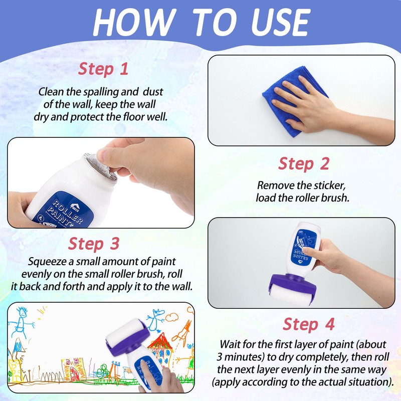 - Easy to Use: This wall repair paint roller brush is very easy to use, even for those with no experience. You don't need special skills or knowledge to complete your repair work because its design and formula make it smooth and have wide coverage. First, clean the wall surface, then open the bottle cap, squeeze out the latex paint, and roll it on the wall. If the coverage is not perfect, wait a few minutes and apply a few more times to achieve a perfect effect