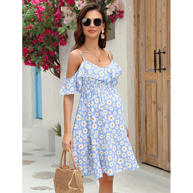 - Características: mini vestidos sexy con cuello de corazón con estampado floral de margaritas, sin mangas, línea A, tirantes delgados ajustables, dobladillo con volantes, vestido con vuelo, hombros descubiertos, vestido de playa bohemio de verano.