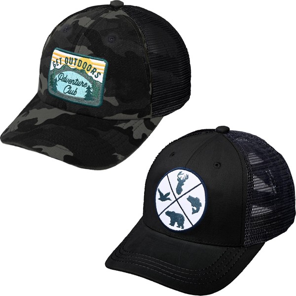 Funky Junque 2 Pk - Trucker Patch Hat Bundle - Get Outdoors (Black Camo) & Outdoors Quad (Black)