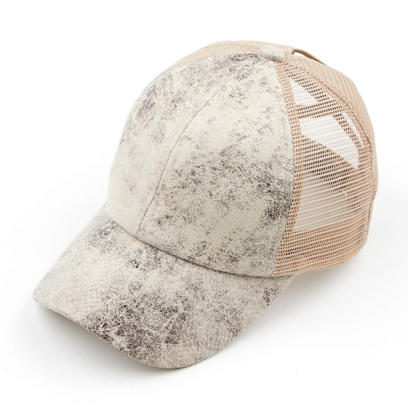 - GREAT LOOK: Distressed, washed hat give off a vintage look. Back of hat has criss-cross elastic bands for ponytail hole that make the hat look great with or without a ponytail. 3 different ponytail holes for the option of a low ponytail/messy bun, middle ponytail/messy bun, or high ponytail/messy bun. With plenty of versatility, this hat design is unique and stylish