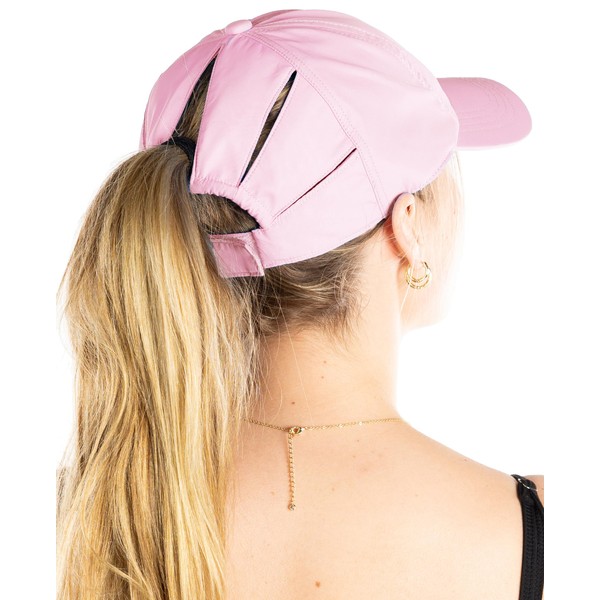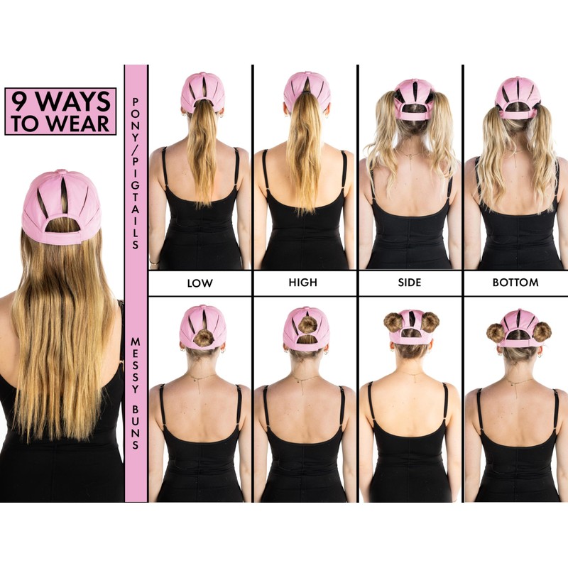 - GREAT QUALITY: Crafted from 100% polyester, these innovative ponytail caps are lightweight, breathable, and designed to wick moisture, ensuring your head stays dry and cool. Featuring five adjustable slits, this baseball cap allows versatile hair styling options—from high ponytails to space buns and pigtails to messy buns. The durable polyester fabric of these sun hats for women maintains its shape and color through frequent wear and washes, making it easy to care for.