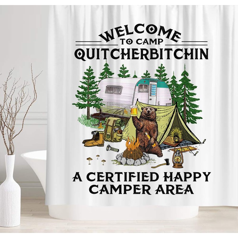 Funny Camper Shower Curtain, A Bear Drink Beer Camping Trailer Rv Tent Campfire in Forest Woodland Welcome to Camp Quitcherbitchin Quote Bathroom Curtain, Fabric Camping RV Shower Curtain 47X64IN