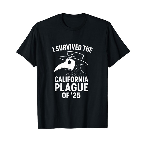 - Love dark humor and sarcastic jokes? This California Plague Survivor 2025 design is for you. Features a detailed, vintage distressed graphic of a plague doctor mask, capturing a funny, historical 'end times' vibe that's sure to be a conversation starter.