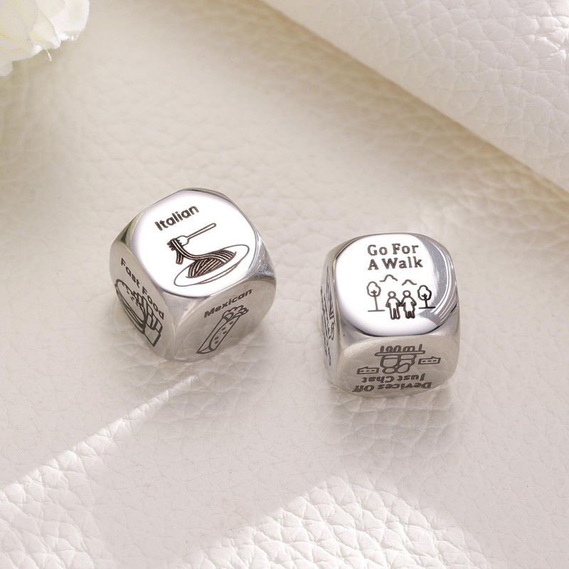 - *Funny Dice Gift for Valentines Day* One dice for dinner options and one for activity ideas – no more indecision about "What's for dinner?" or "What to do tonight?" The dice set are made of stainless steel, size of 16 mm, sturdy, not easy to rust, fade or tarnish, it comes a gift box, perfect for gift giving
