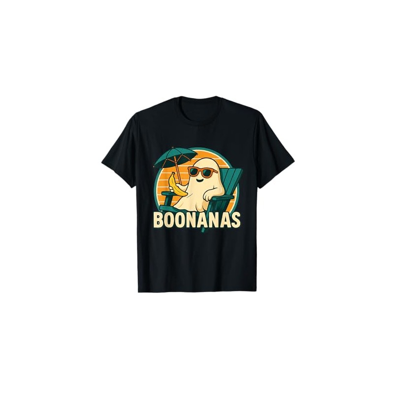 - Spooky ghost relaxing with a banana and text saying BOONANAS, Summerween style. Humorous creepy cute ghost lounging on a beach chair with a banana, blending summer and Halloween for bananas lovers.