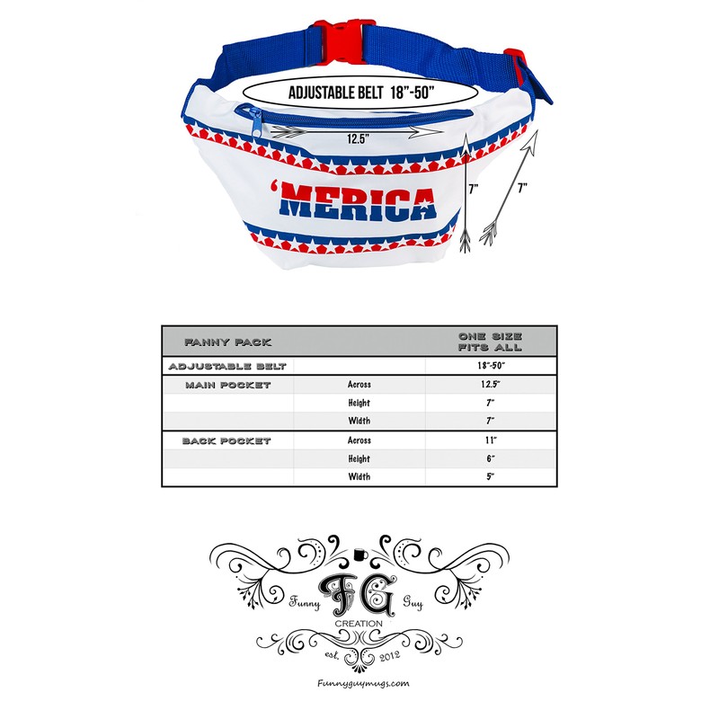 CONTENTS: * 1 New Fanny Pack * Contents Come New In A Sealed Bag MATERIAL: * Made Of Premium Nylon 420D FEATURES: * 2 Pockets * UV Reactive * Adjustable Waist * Quick Snap Closure Buckle SIZING: * Fits Waists Up To 40" Round * Please See Sizing Image For More Details ABOUT FUNNY GUY MUGS: This Fanny Pack Was Created By Funny Guy Mugs. Funny Guy Mugs Is A Trusted Company Founded Whose Mission Is to Create High Quality Products That Put A Smile On Your Face.