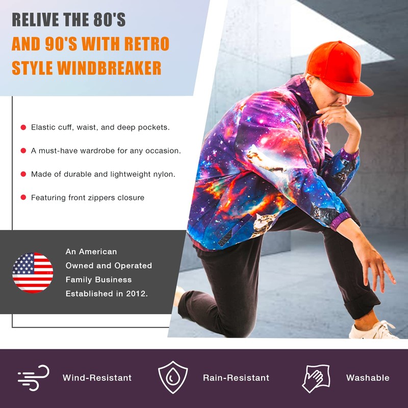• Zip-up Design, Elastic Cuffs, and Convenient Storage: These 80's retro windbreakers have a zip-up front closure, making them easy to put on and take off. Alongside the elasticized cuffs and hems that ensure a snug fit and keep the jacket in place during physical activities, you'll find the added functionality of two zipper pockets. These pockets offer convenient storage, perfect for stashing essentials or keeping your hands warm while you rock that classic 80s look.