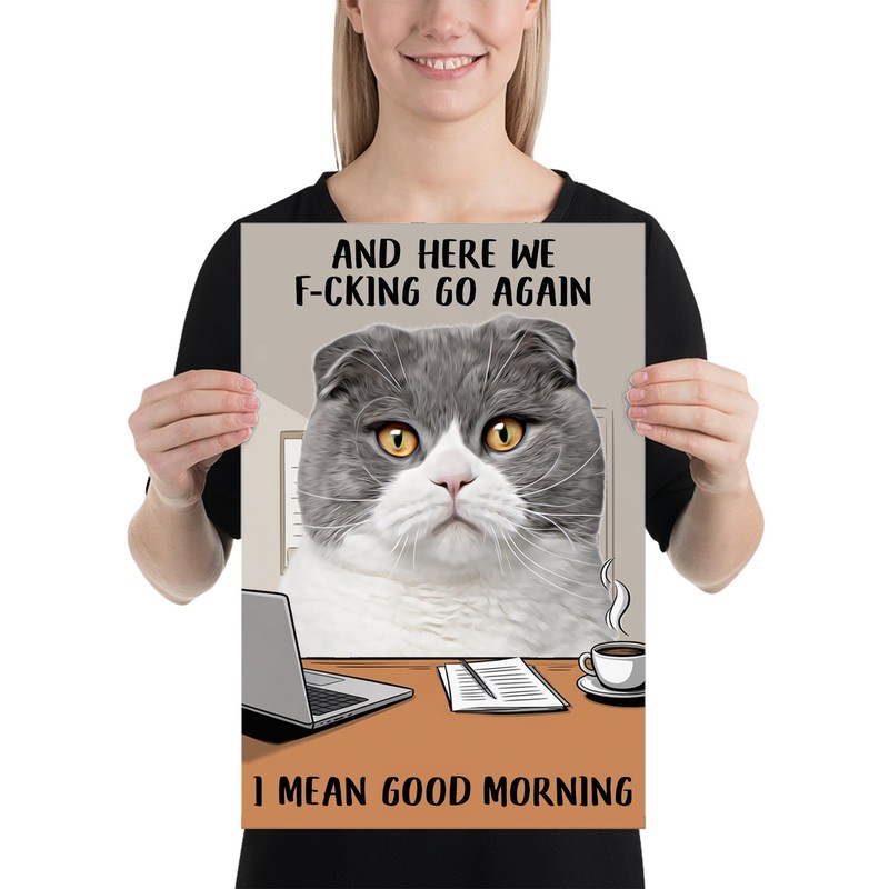 Funny Saying And Here We F-cking Go Again Wall Art - Grey White Scottish Fold Cat Poster 12x18 Unframed Photo Paper - Sarcastic Work Humor Office Decor Gifts for Cat Lovers