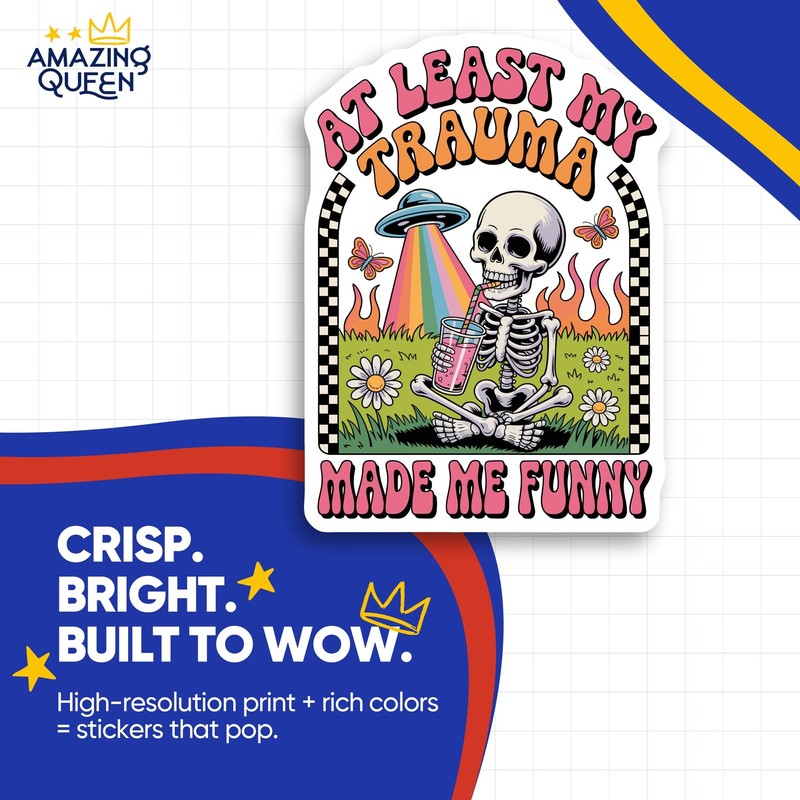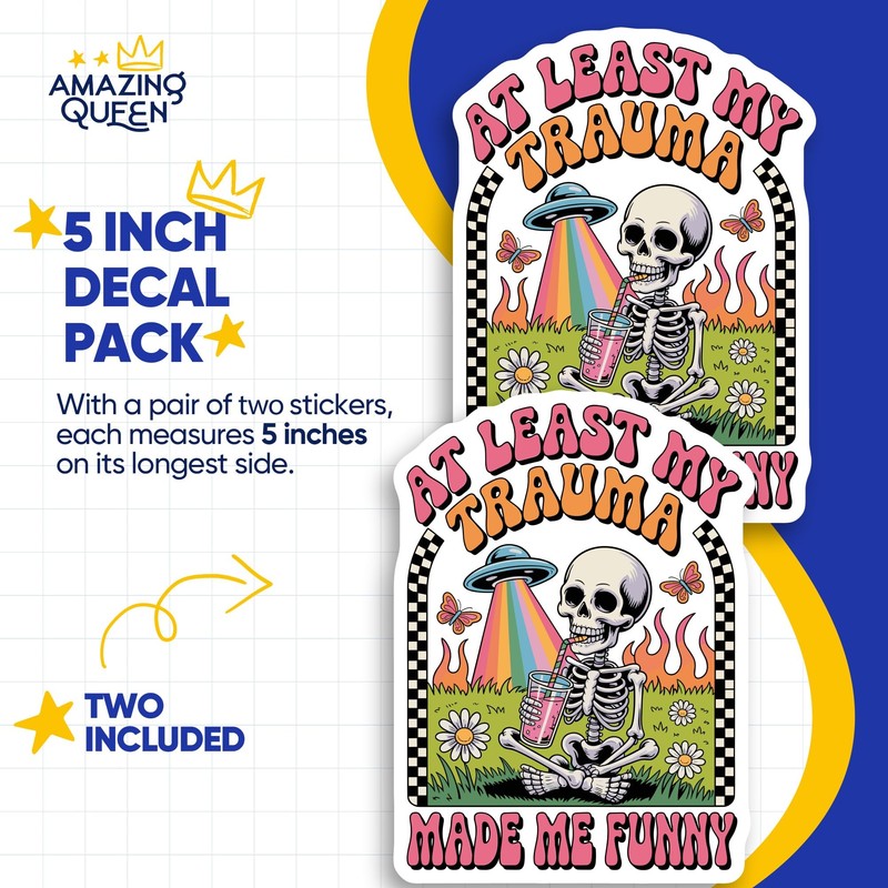 Funny Skeleton Stickers - at Least My Trauma - UFO Rainbow Beam - 2 Pack - 5" Wide Design - Adheres to Laptops, Tumblers, and More - Made in The USA - AQS3962