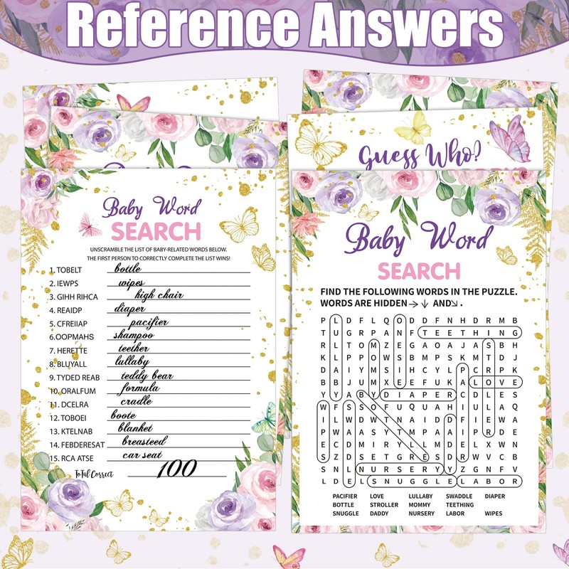 - Butterfly Themed Delicate Designs: the hilarious baby shower game sets include 8 different games, including butterfly themed baby descriptions and wishes, guess who, baby price is right, baby word search, bingo game, measure the belly baby shower game and don't say baby shower games, ideal for entertaining your guests during the baby shower activities, butterfly baby shower favors for baby shower adopt neutral style, and are designed with many lovely butterfly elements