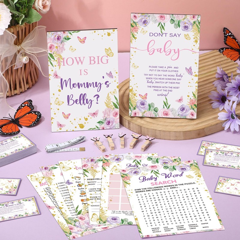 - Butterfly Baby Shower Games Set: butterfly baby shower decorations includes 8 sets of butterfly theme games for baby showers in the package (each set includes 50 cards; A total of 300 cards and 20 pencils), 1 set of measure the belly baby shower game (including 1 piece of how big is mommy's belly sign, 50 pieces of guessing cards and 2 rolls of measuring tapes), and 1 set of don't say baby shower game supplies (including 1 piece of wooden don't say baby sign, 50 pieces of wooden clothespins)