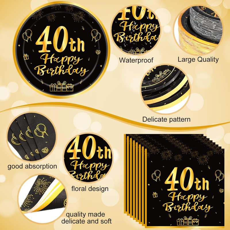 - Generous Package: our 40th birthday party decorations in black and gold contain 100 paper plates ( 2 sizes), 50 napkins, 50 coffee cups, 50 sets of knives, forks, and spoons each, and 50 straws, it's an ideal solution for a 40th birthday theme party, and we also include 2 large sized 40th birthday theme tablecloths