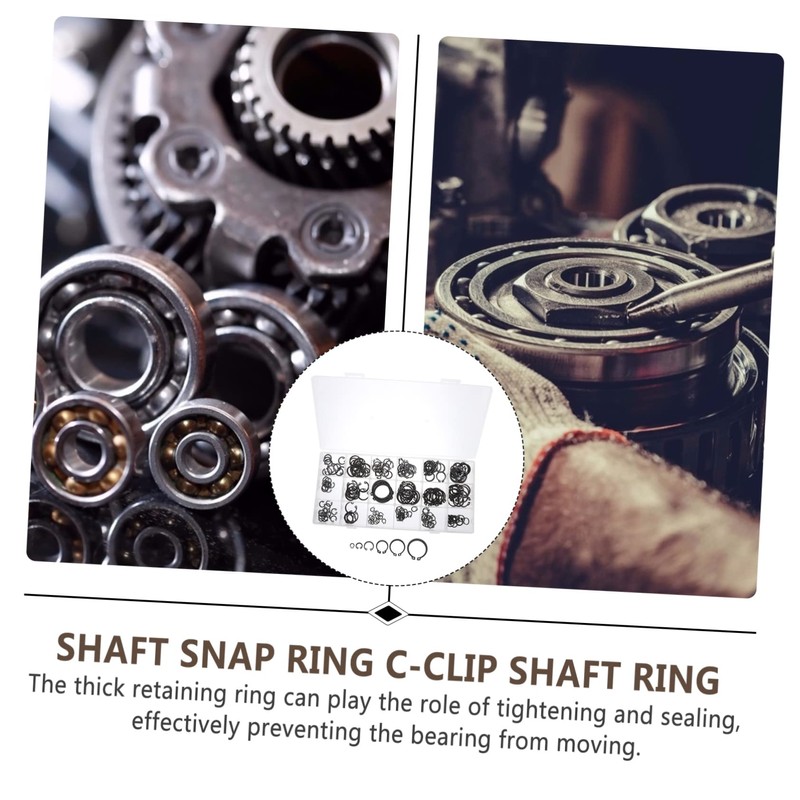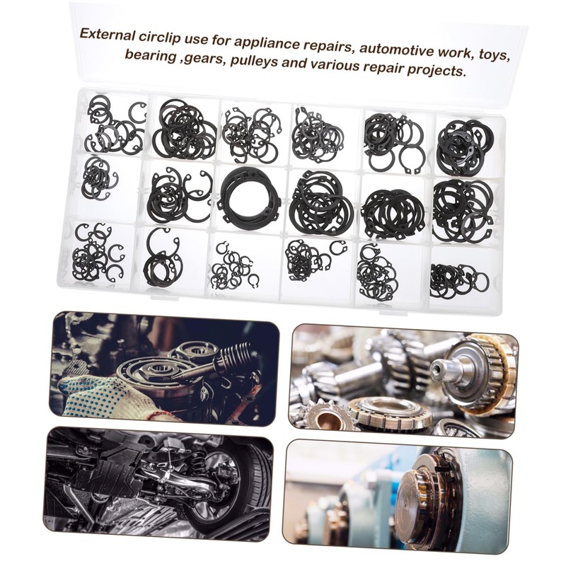 • Shaft snap ring--each size is in it's individually compartment in a transparent storage case, easy to get the size you need,carbon steel c-clip
