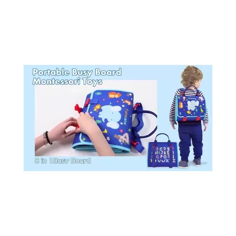 - 【8 in 1 Busy Board】Funsland 8-page busy board has lots of activities for kids to practice their fine motor skills, including zips, laces, belts, buttons, clocks, calendars, shape matching, threading and numbering, the alphabet, animal puzzles and more.