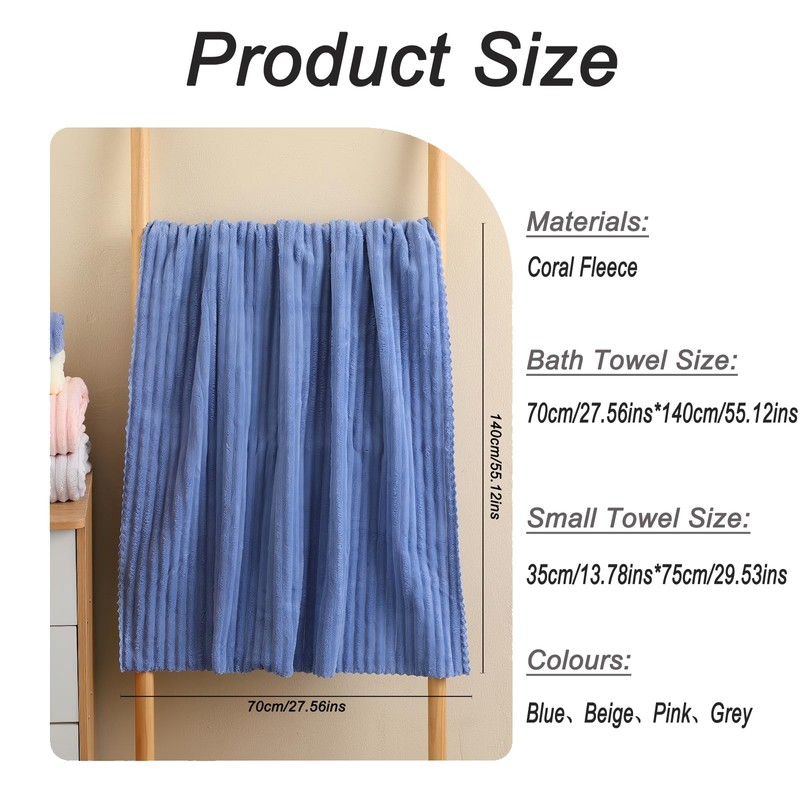 FUNTALE Coral Fleece Towel and Bath Towel Set Extra Thick Absorbent Wave Pattern 2 Piece Set for Home Spa and Travel Soft and Quick Drying (Blue)