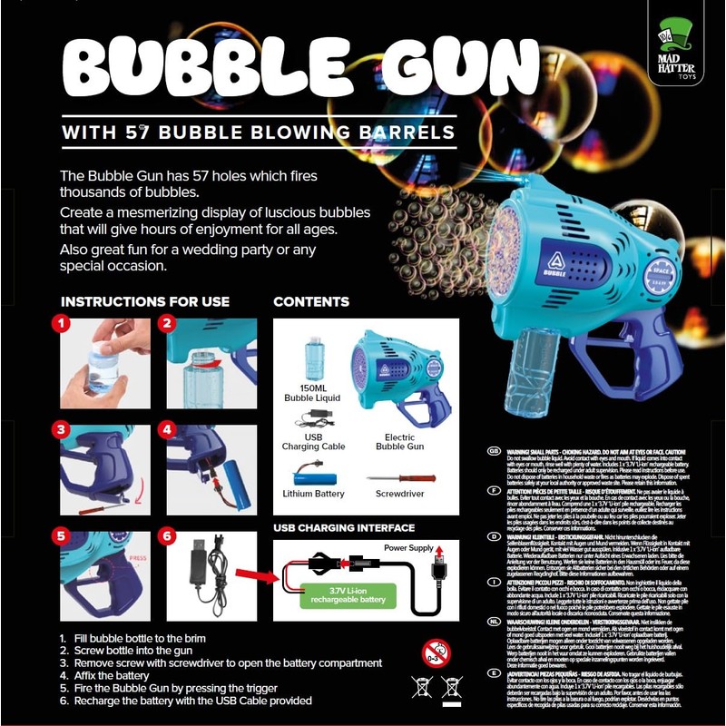 - 🔵 57 Bubble Blowing Barrels – Unleash a spectacular bubble storm with every pull of the trigger!
