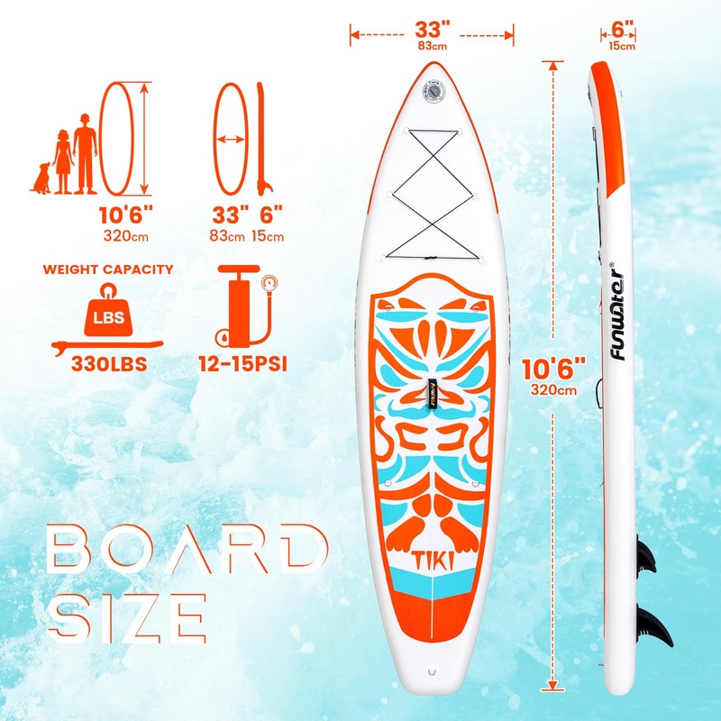 - [Unique Design] Inspired by totem culture, this orange and blue colourway paddleboard is versatile enough to appeal to paddleboarders on the golden beaches of Hawaii, where Funwater users have always believed in the joy our boards can bring to friends and family