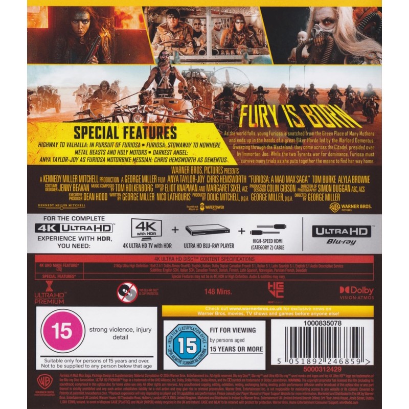 All Regions. As the world fell, young Furiosa is snatched from the Green Place of Many Mothers and falls into the hands of a great Biker Horde led by the Warlord Dementus. Sweeping through the Wasteland they come across the Citadel presided over by The Immortan Joe. While the two Tyrants war for dominance, Furiosa must survive many trials as she puts together the means to find her way home.