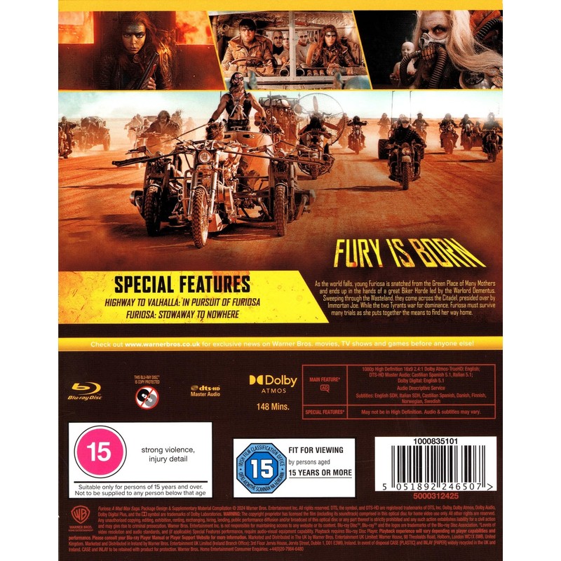 All Regions. As the world fell, young Furiosa is snatched from the Green Place of Many Mothers and falls into the hands of a great Biker Horde led by the Warlord Dementus. Sweeping through the Wasteland they come across the Citadel presided over by The Immortan Joe. While the two Tyrants war for dominance, Furiosa must survive many trials as she puts together the means to find her way home.