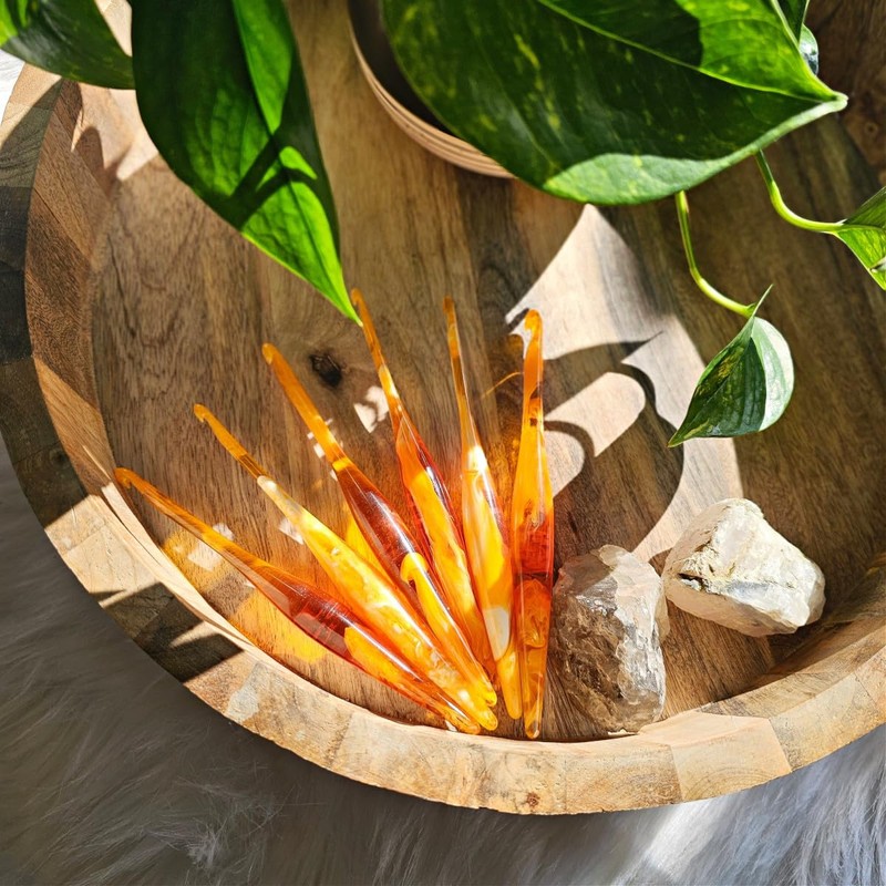 Streamline Zodiac hooks are first hand cast with a cosmetic-quality resin and resin-based pigments and then turned and carved to the ergonomic Streamline shape. All Streamline Swirl hooks have their size engraved on the body of the hook just like the wooden Streamlines. Also they have the same length, width, and ergonomic proportions as the wooden Streamlines. The resin Streamlines are 0.2 - 0.3 oz heavier than the wooden Streamlines. For comparison, a wooden Streamline is 0.5 oz, a resin Streamline is 0.75 oz, and an Odyssey is 1.5 oz.