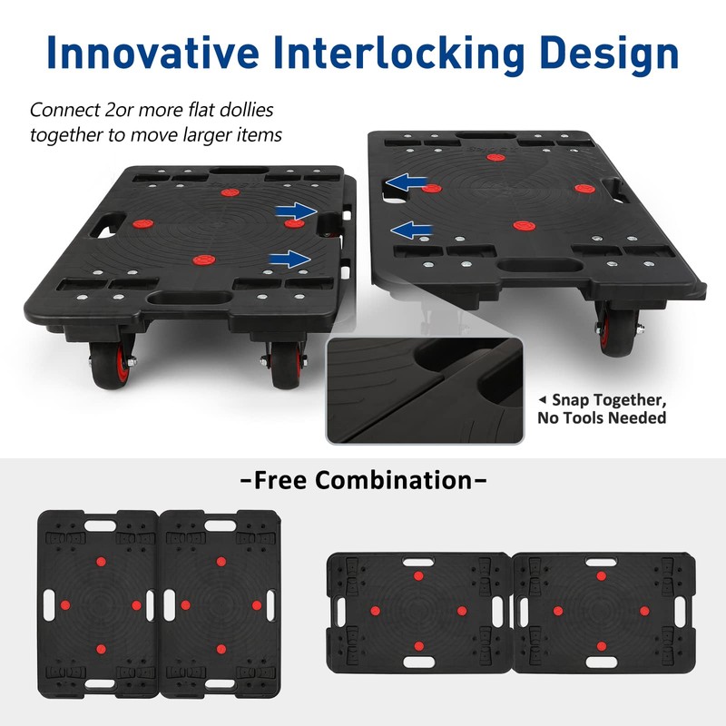 - [Innovative Interlocking Design]: You can connect two or more flat dollies together to move larger items just snap the two together, no tools or hardware needed.