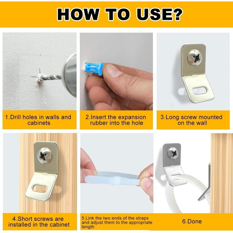 - 🔧 How to Use: First, drill holes in walls and cabinets; Second, fix the steel brackets with screws on the wall and cabinets. Third, thread the steel brackets holes with nylon straps and fix them.