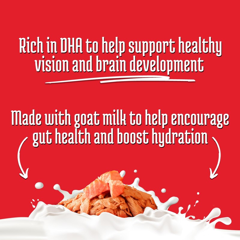 - Fussie Cat with Goat Milk is rich in DHA to help support healthy vision and brain development and is fortified with vitamins and minerals