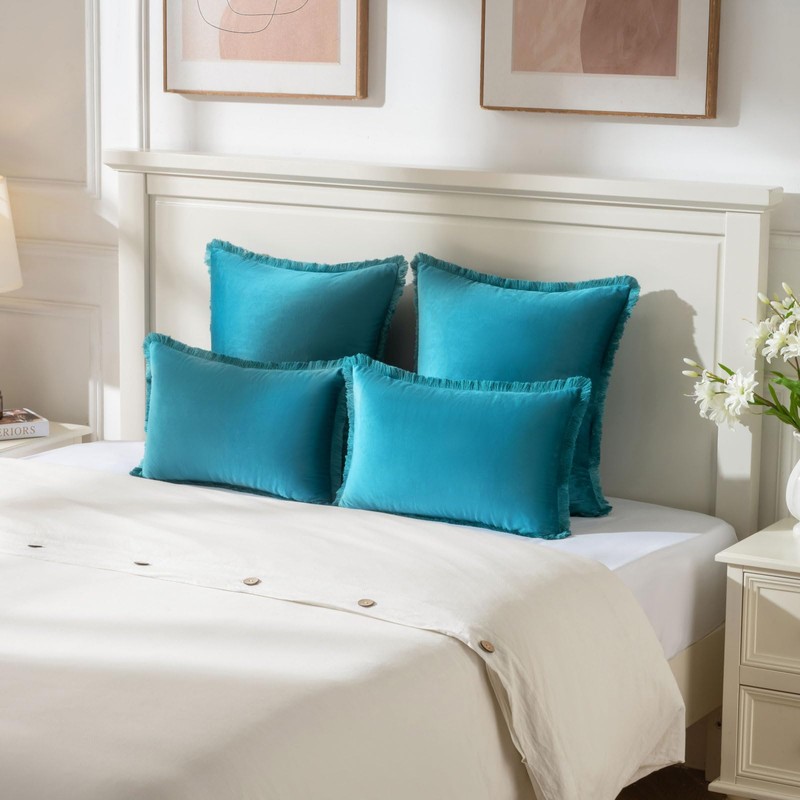 FUTEI Teal Boho Throw Pillow Covers with Tassels 18x18 Inch Set of 2,Soft Velvet Decorative Cushion Case,Home Decor for Couch Bed Living Room