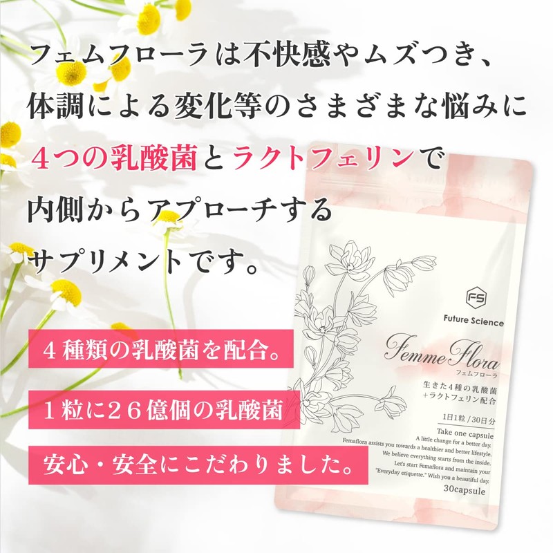 - 【デリケートなお悩みに】フェムフローラは不快感やムズつき、においなど、体調による変化等のさまざまな悩みに4つの乳酸菌とラクトフェリンで内側からアプローチするサプリメントです。