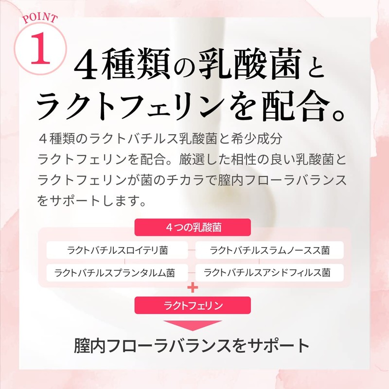 - 【4種類の乳酸菌とラクトフェリン】腸内・膣内環境をケアする4種類のラクトバチルス乳酸菌と希少成分ラクトフェリンを配合。厳選した相性の良い乳酸菌とラクトフェリンが膣内フローラバランスをサポートします。
