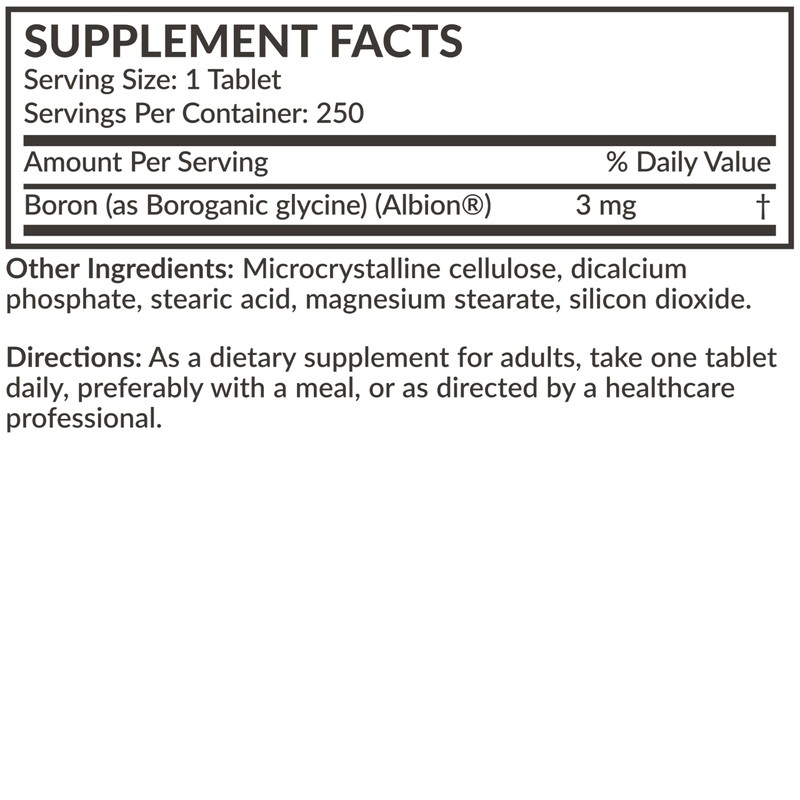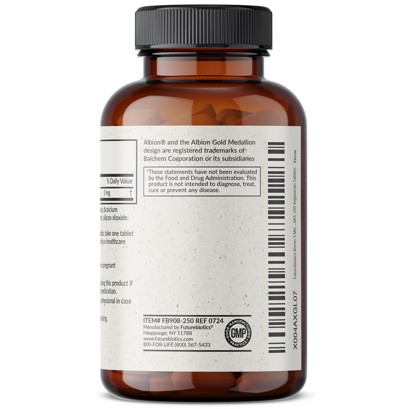Futurebiotics Boron provides 3 MG of Boron (as Boroganic Glycine) to support strong bones.* By utilizing the premier manufacturer of chelated minerals (Albion Minerals), Futurebiotics Boron 3 MG provides superior absorption, stability and overall quality. Laboratory tested and free of GMOs, Gluten and Soy, Boron 3 MG is in-house tested and carefully manufactured by trained professionals in our state-of-the-art facility that is located in Hauppauge, New York. Boron 3 MG is Vegan/Vegetarian friendly and contains no ingredients derived from animals.