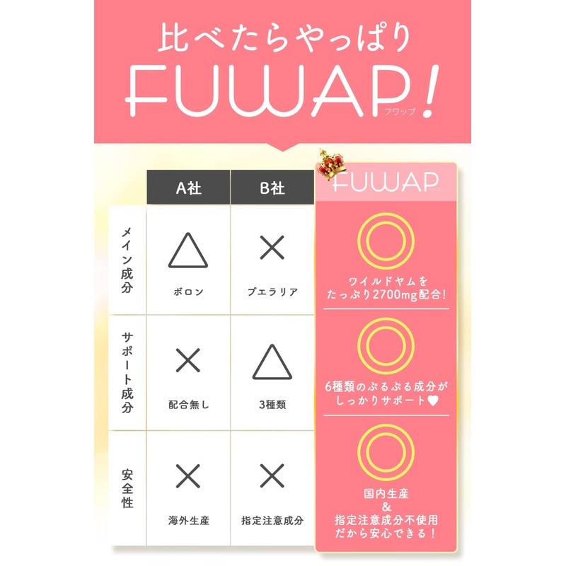 - ✅【こだわり】本当に使いたいと思う商品を女性だけのチームで開発。FUWAP(フワップ)は古くから女性らしさを高めると重宝されてきた天然成分「ワイルドヤム」を贅沢に配合し、さらに実感できるようにこだわりの天然成分(チェストベリー、大豆イソフラボン、ザクロエキス、発酵トマト、プラセンタ)でサポートします。