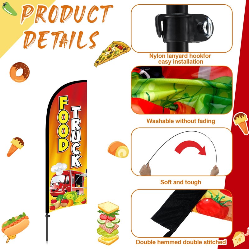 - Eye Catching Design for Attraction: this food truck feather flag set features bright colors and eye catching patterns, designed to draw attention from distances near and far; Our advertising flags have been tailored to make your business stand out among the rest