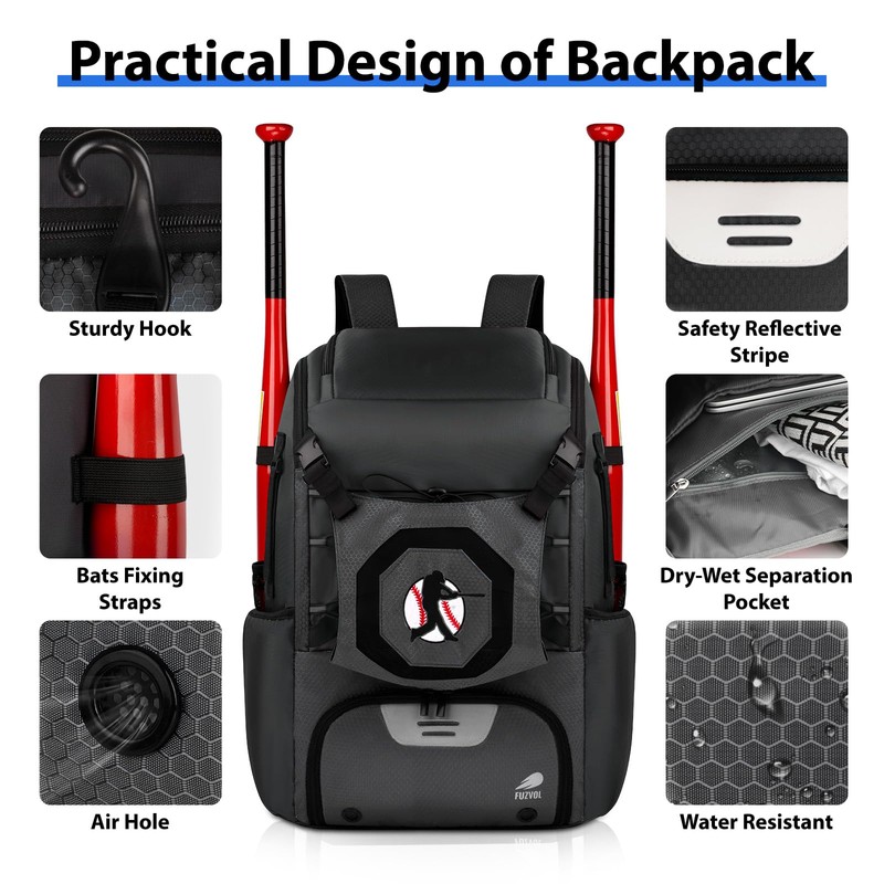 - Independent Shoe Compartment: FUZVOL baseball softball bag features a separate zipper shoe pocket, allowing you to easily store your shoes, cleats. 2 Ventilation holes keep your shoes dry and no smell, even after intense games. Fence hook design, keeps your baseball bag off the ground