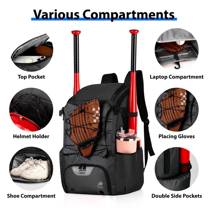 - Dry-Wet Separation Pocket: Our baseball backpack has a separate waterproof compartment, you can store soiled clothes or wet items without worrying about them mixing with your clean gear. The top zippered pocket can store your phone, and keys