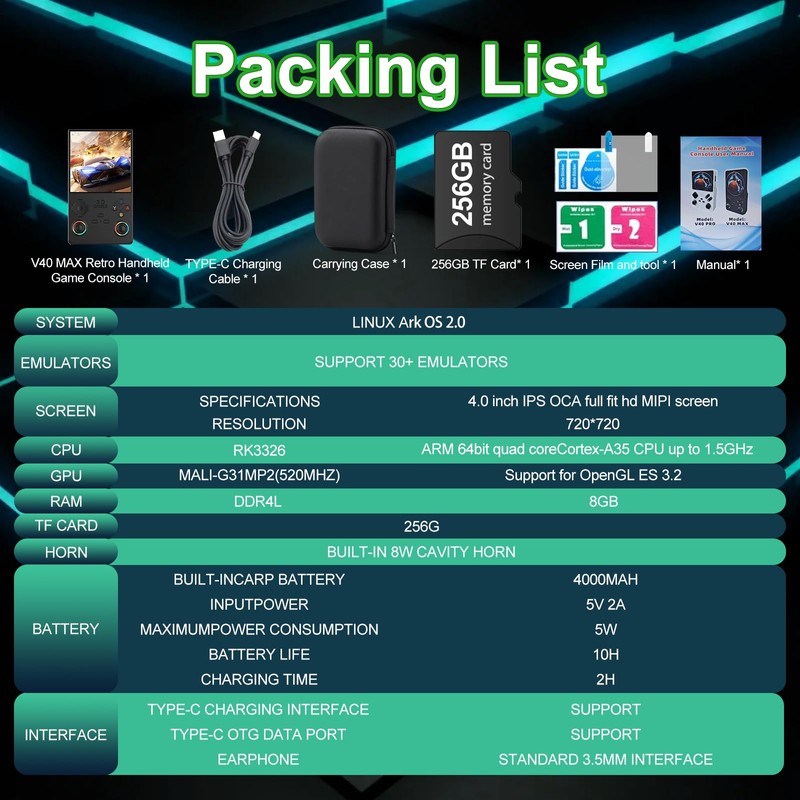 - V40 MAX new system 1.5GHz 64-bit RK3326 CPU, Mali-G31MP dual-core GPU, 4GB*2 RAM DDR3L; the new operating system provides a more responsive and smoother experience. Pre-installed with 40,000+ games, it supports 12+ mainstream simulators, and the 256GB extended memory allows for adding more games.Save is FN+R1, and loading is FN+L1