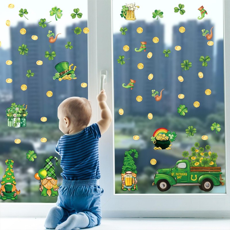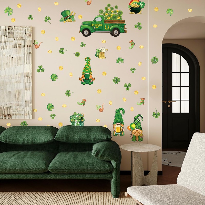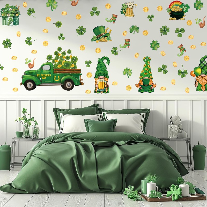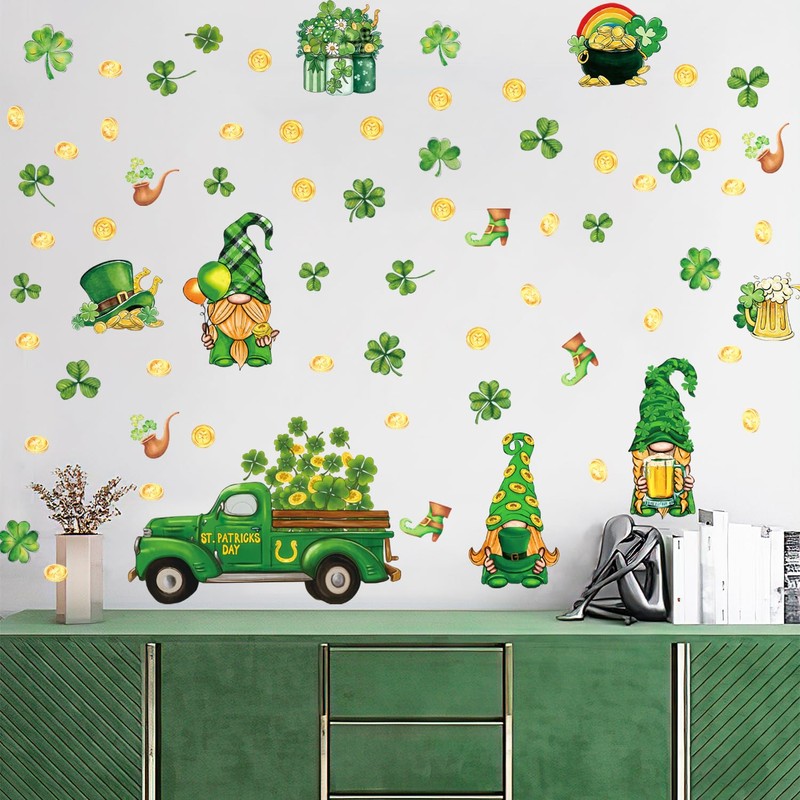 - 【St Patrick's Day Wall Stickers】 This St. Patrick's Day themed wall decal features a fresh green colour scheme, cleverly incorporating classic elements such as green trucks, dwarf demons, shamrocks and gold coins. Whether it's a family gathering or a friend's party, it's an ideal decorative choice to set the mood.
