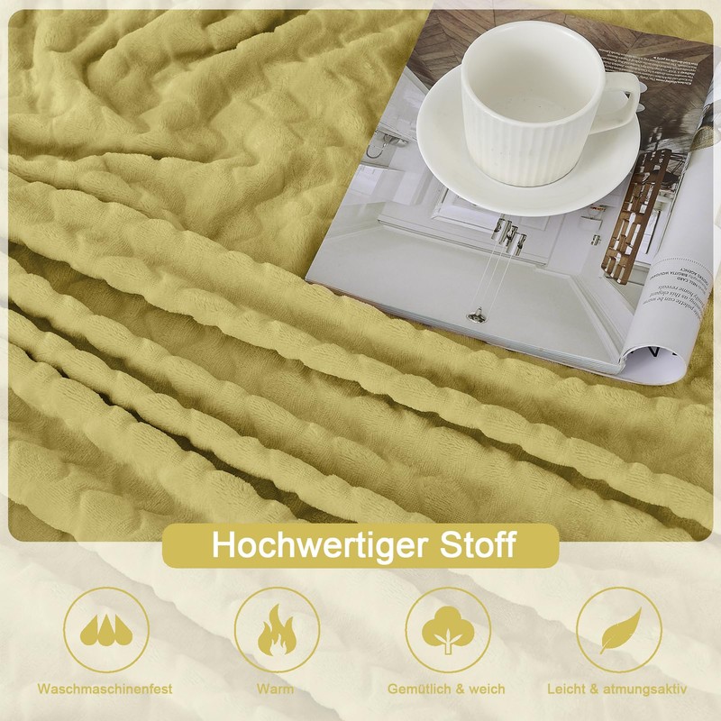 - Classic and ruffled design: it is made of faux fur jacquard woven and has a wave pattern. This classic blanket is available in a variety of colours, so you can adapt the blanket to your home decor according to your taste
