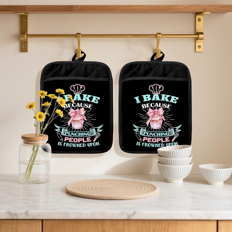 Fyecoluo Funny Baking Pot Holders 2 Pack Set, Gifts for Baking Lovers, I Bake Because Punching People is Frowned Upon Heat Resistant Oven Hot Pads for Kitchen Countertop Baking,054 Potholder