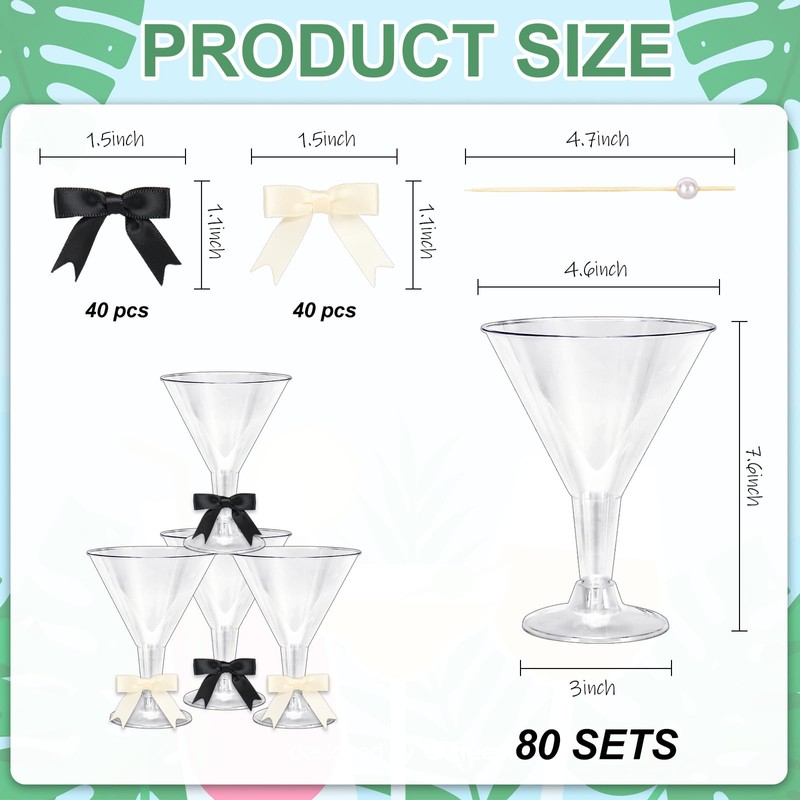 - YOU WILL GET: 80 Pcs plastic martini glasses, 80 Pcs pearl cocktail picks, 40 Pcs black bow and 40 Pcs champagne bow, complete packs with sufficient quantity for you to enjoy your drinking time