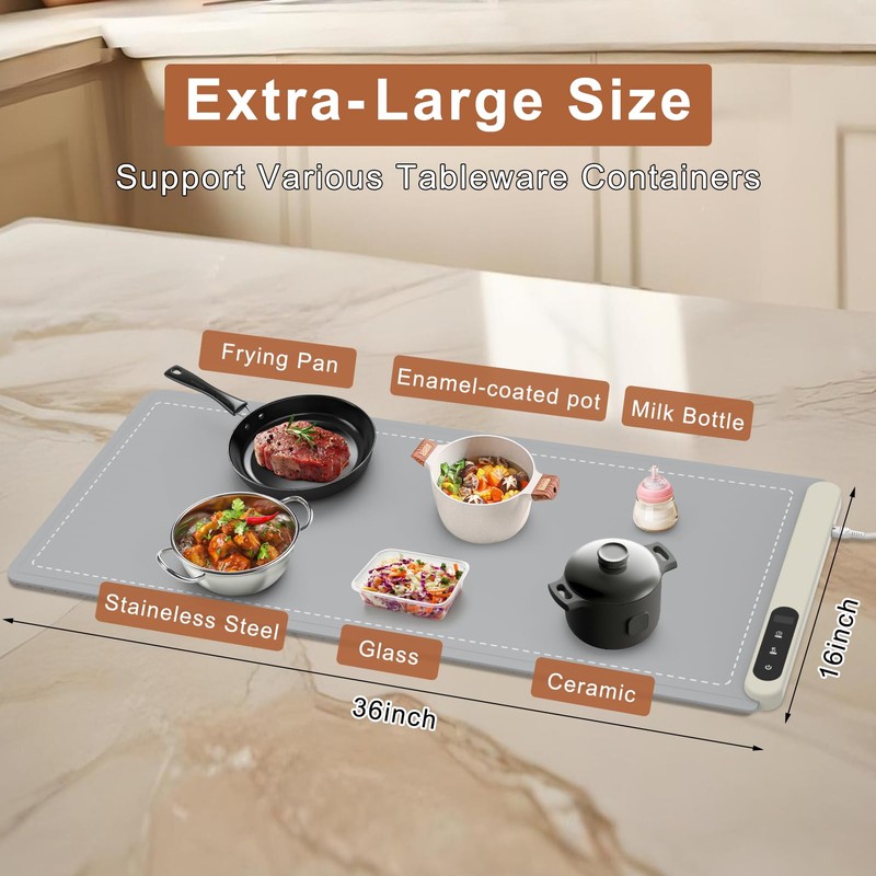 • Premium Silicone Nano Material: Our electric warming tray is made of premium flexible silicone nano material, which is splash-proof, stain-proof and oil-proof, combining durability and practicality. It can be folded and stored without creases, guaranteeing long-lasting use.