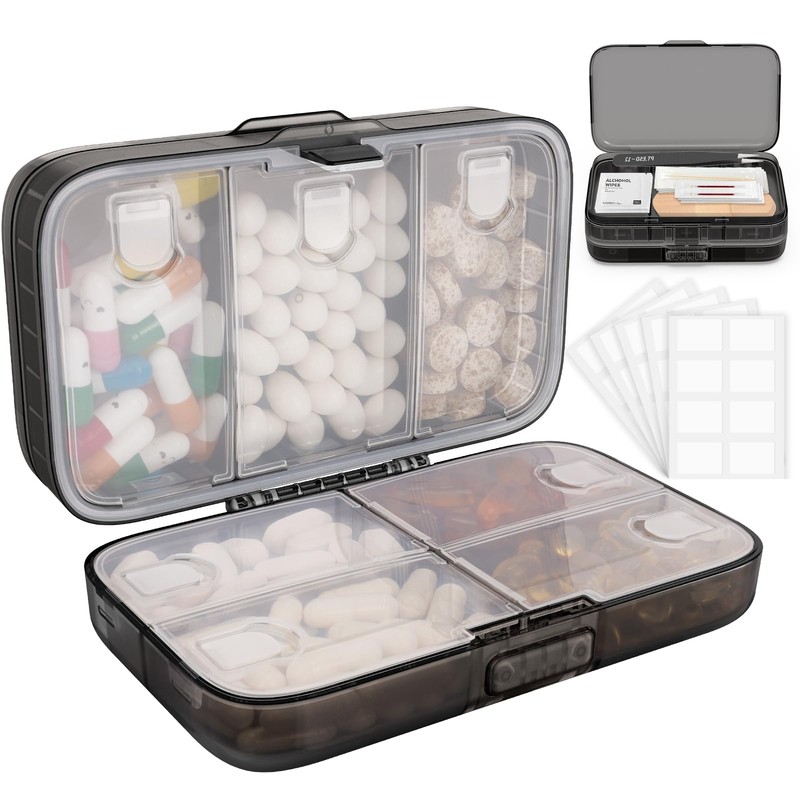 - Easy to Carry:Size:5.9 x 3.5 x 2.2inch.Can easily placed in your wallet,suitcase,backpack,handbag.Inner lid and outer lock provide double protection,doesn't pop open even if dropped. Silicone pull ring on the inner cover for easy opening.The DETACHABLE lids are easy to clean. After you stop taking pills, you can reuse this pill box to store small items such as buttons, beads, jewelry,screws,game cards,card readers,memory cards,adapters,wired headphones,small IT-related items and so on.