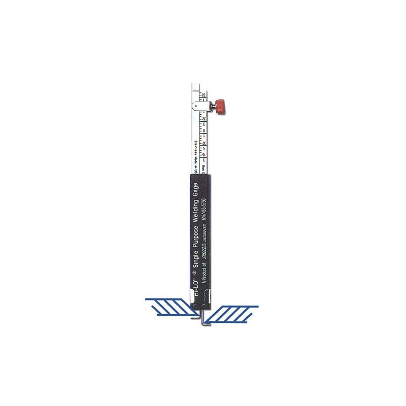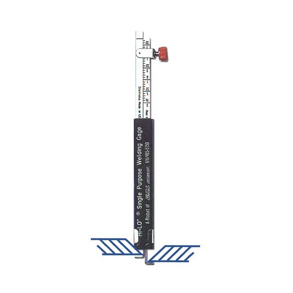 WG-2 Economy Single Purpose HI-LO Welding Gage is designed for internal alignment and determining rootweld spacing. Internal HI-LO gage. Four quick steps check internal alignment You can check the internal alignment of your fit-up quickly with the WG-2 HI-LO Gage. 1. unlock the retaining screws. Press the gage legs beyond the barrel. 2. insert the legs (wires) into the root gap space of the two pieces of pipe to be fitted. Turn the gage 90 º, being careful to apply a constant back pressure to the barrel. 3. Hold the gage as square as possible with the fitting to obtain an accurate reading. Lock the retaining screw, Reverse the 90º turn and remove the gage. You've now ready to read the increment opposite the red line. 4. When the red line aligns with the 1/32 increment you have a good internal alignment and fit-up. Misalignment can be determined from the zero line by increment markings of 1/16 inch. Rootweld spacing gage. Easy operation determines rootweld spacing. 1. Unlock the retaining screw and insert the gage interior alignment stops between the two pieces of pipe to be fitted. 2. Insert the leg with the long taper into the root gap until it makes contact with both sides of the gap. Relock the retaining screw, remove the gage and read it. 3. The scale is calibrated in fractional dimensions from 1/32 to 3/16 inch in 1/16 inch increment markings. The readout you receive represents the amount of the rootweld gap.