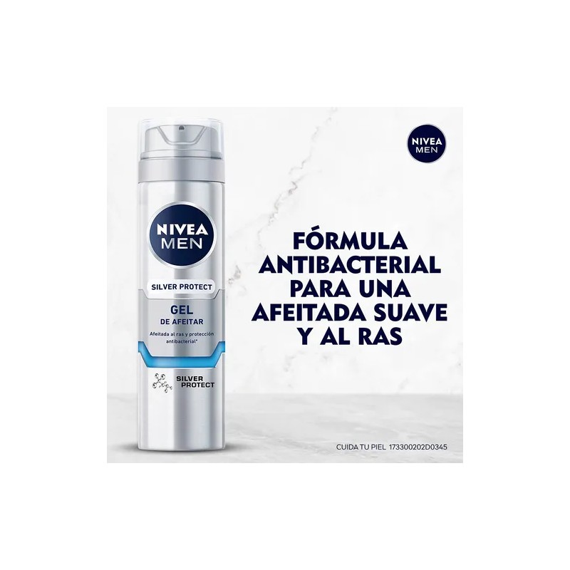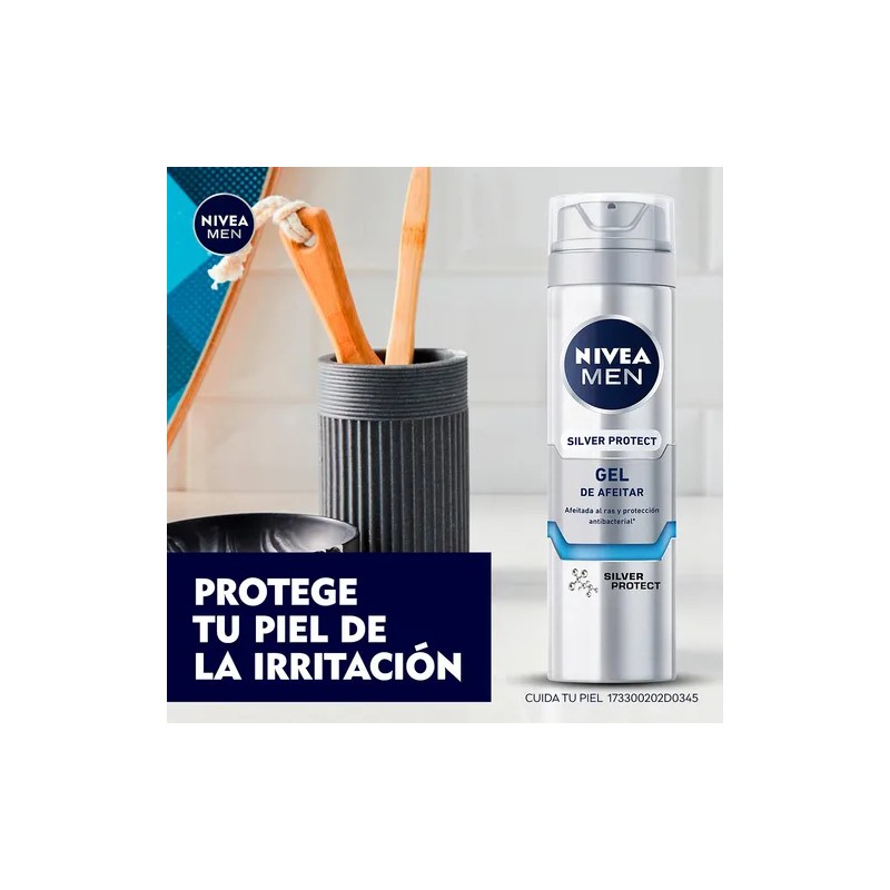 NIVEA MEN Gel de afeitar Silver Protect protege tu piel de la irritación. Este gel para afeitar cuenta con una fórmula avanzada que incluye iones de plata, manzanilla y provitamina B5, proporcionando un afeitado limpio y al ras. Su acción como escudo deslizante sobre la piel ayuda a protegerla de la hoja de la navaja, resultando en un rasurado suave y una piel protegida, luciendo sana y humectada después del afeitado. Para optimizar los resultados, se recomienda usar en conjunto con la loción para después del afeitado NIVEA MEN Silver Protect.