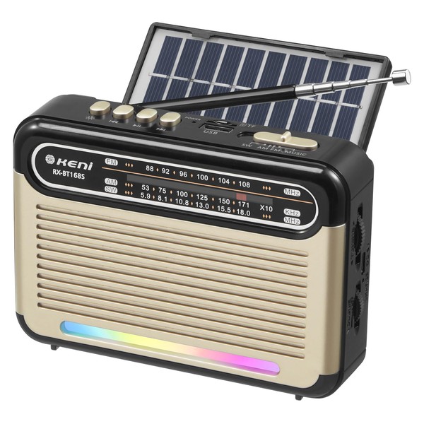G Keni Portable Solar Radio AM FM SW with Rechargeable Battery Operated, Shortwave Bluetooth Radio Strong Reception, USB/TF Card Input, Solar Panel, Big Speaker with Ambient Light (Golden&Black)