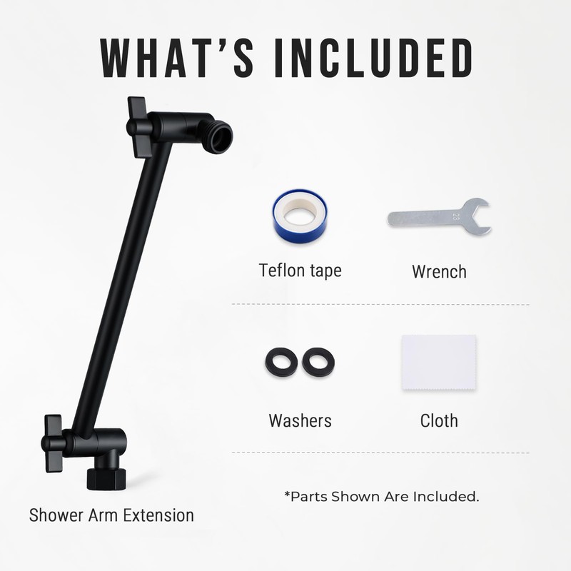 Package includes: 1 shower head extender, 1 teflon tape, 2 spare washers, 1 wrench and 1 spare hex screw and hex key, 1 cloth, 1 illustrated manual,complete accessories, easy to start installation.