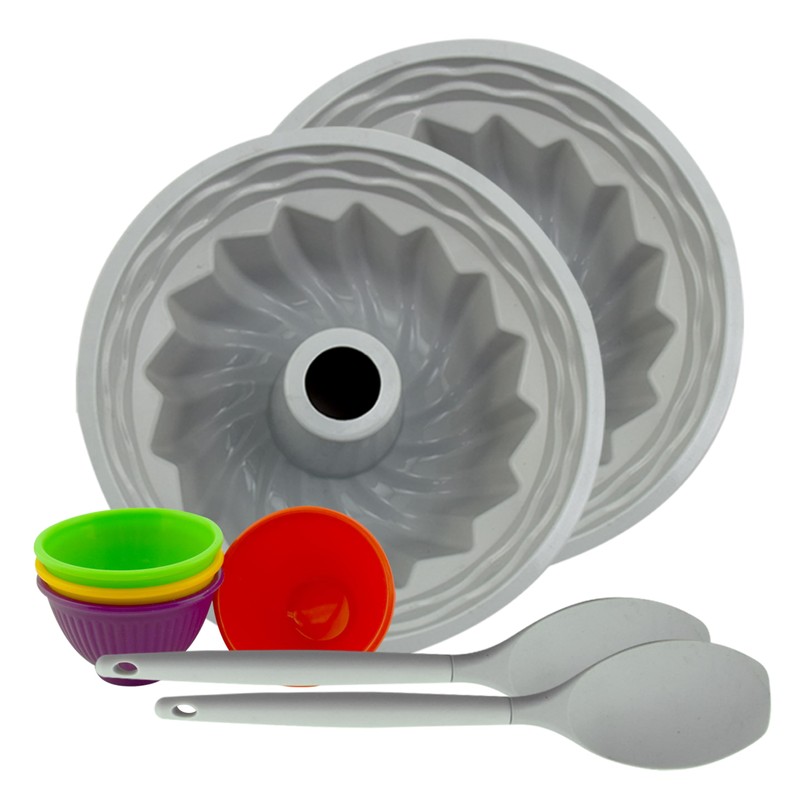 - Set includes (2) Bundform Pans, (2) Spoonulas, and (1) 4-Piece Pinch Bowl Set; use pinch bowls to hold sprinkles, drizzles, and toppings to decorate your baked good; included spoonula allows for easy scraping and scooping of batter to bundform pan